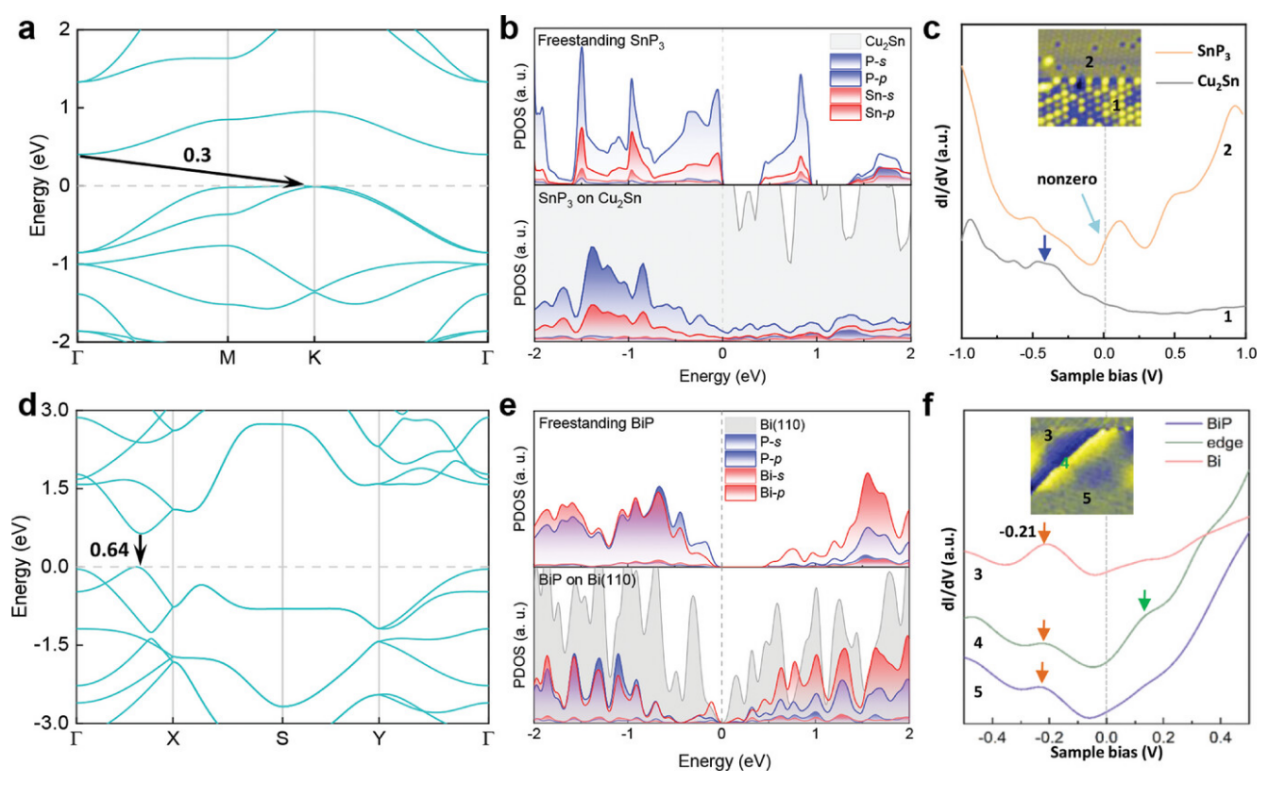 为深入理解生长材料的原子结构和物理性质,该团队开展了一系列基于密度泛函理论(DFT)的第一性原理计算。DFT模拟得到的SnP3/Cu2Sn和α-BiP/α-铋烯的STM图像与实验结果高度一致(图3),证实了二维二元磷化物SnP3和α-BiP的成功合成。优化后的几何结构表明,SnP3和Cu2Sn之间的距离为1.73 Å,远小于范德华外延生长中外延层与衬底之间的距离(≈3 Å)。根据差分电荷密度的计算结果,SnP3与Cu2Sn之间存在明显的电荷转移,反映了二者较强的界面相互作用。与此相反,α-BiP与α-铋烯的距离为2.88 Å,且电荷转移程度较小,相互作用较弱。