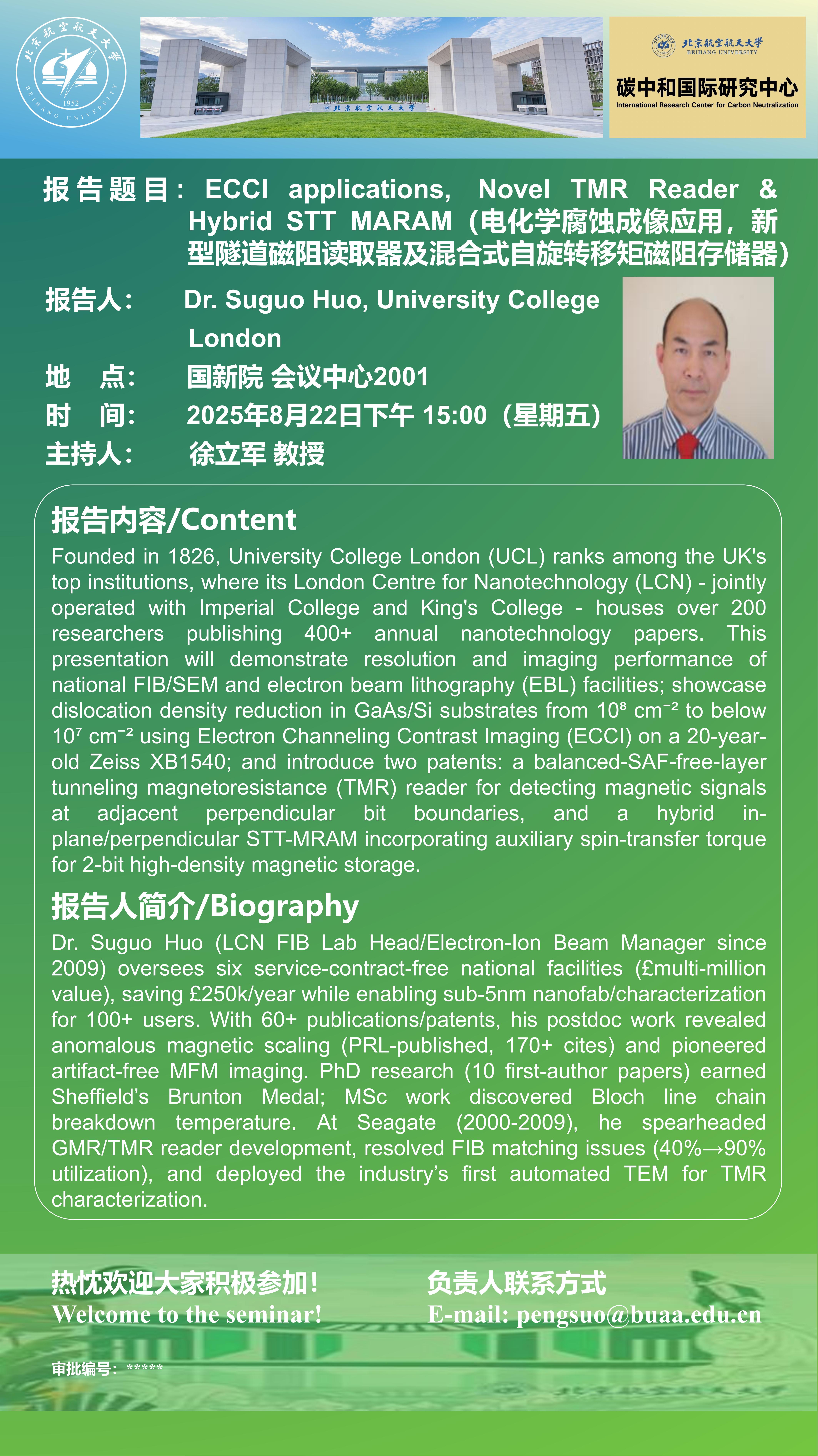 Dr. Suguo Huo (LCN FIB Lab Head/Electron-Ion Beam Manager since2009) oversees six service-contract-free national facilities (£multi-millionvalue), saving £250k/year while enabling sub-5nm nanofab/characterizationfor 100+ users. With 60+ publications/patents, his postdoc work revealedanomalous magnetic scaling (PRL-published, 170+ cites) and pioneeredartifact-free MFM imaging. PhD research (10 first-author papers) earnedSheffield’s Brunton Medal; MSc work discovered Bloch line chainbreakdown temperature. At Seagate (2000-2009), he spearheaded GMR/TMR reader development, resolved FIB matching issues (40%→90%utilization), and deployed the industry’s first automated TEM for TMRcharacterization.