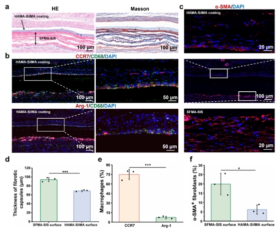 组织学评估显示(图5),在植入14天后,HAMA-SilMA涂层表面作为保护性屏障,与宿主组织明显分离并有效阻止了宿主细胞和组织的侵入,进而减少组织粘连的程度。HAMA-SilMA侧的巨噬细胞显示出更高的M1表型,且显示出更薄的纤维囊和更低的α-SMA阳性成纤维细胞表达。