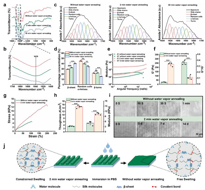 为了使SFMA微槽涂层吸水后结构稳定,研究采用水蒸气热处理工艺。如图2所示,与未处理的微槽涂层相比,经过水蒸气处理后的SFMA微槽涂层的二级结构发生变化,进而导致其力学和结构稳定性有显著提升。