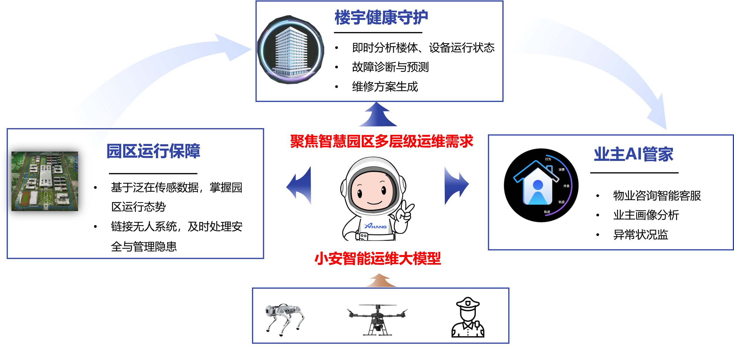小安智能运维大模型是一款面向智慧园区的运维利器,通过自研智能物联网关链接物理世界;通过边端和云端大模型协同认知推理来实时感知、智能分析物理世界运行状态;发展具身智能调动控制设备、运维人员和无人系统自动处置风险;独创“聆听 - 理解 - 探询 - 诊断”四步交互模式,使运维响应更精准高效;基于园区运行数据对个体行为进行画像分析,推动物业管理从被动响应转向“主动预警”。小安智能运维大模型满足园区运行保障、楼宇健康守护、业主智慧管家等多层级运维需求,成为主动、智慧的运维大脑。